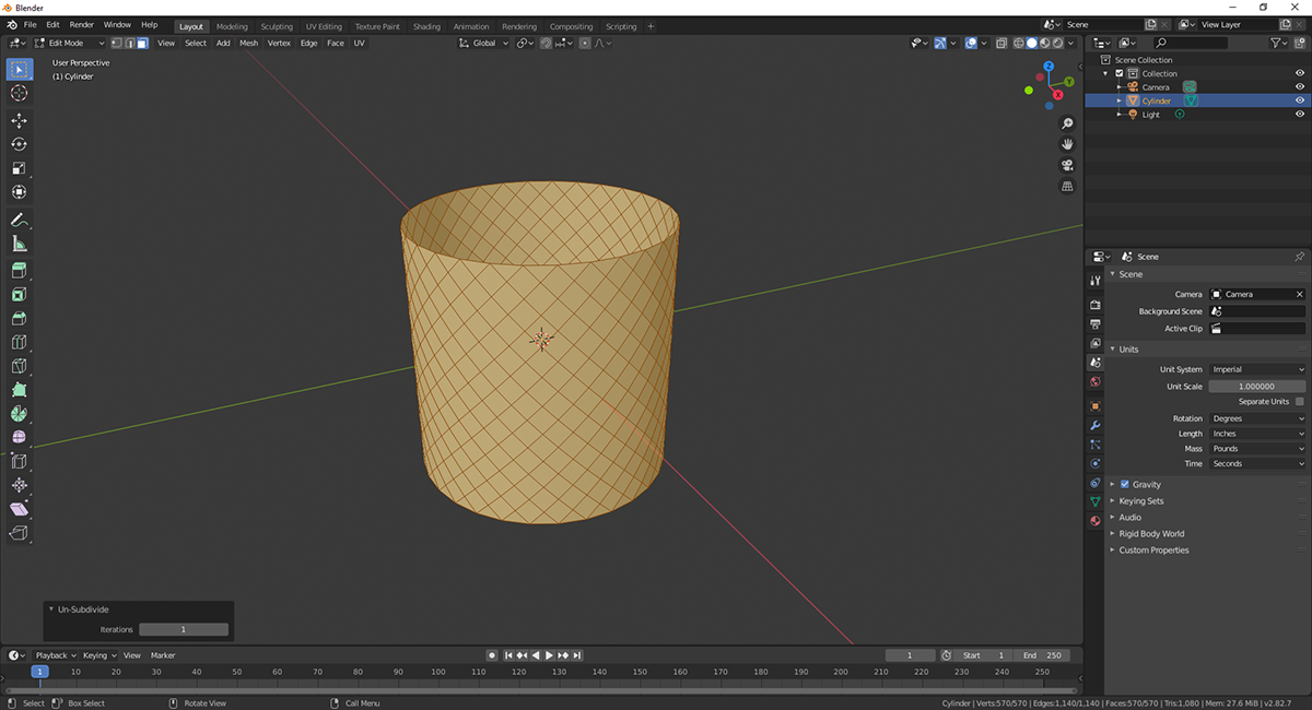 Now we want to un-subdivide. Hit “3” (not on the number pad) to go into Face Mode. Hit “A” to select all the faces. Right click to bring up the menu and click “Un-subdivide”. In the properties panel, change the iterations to 1.