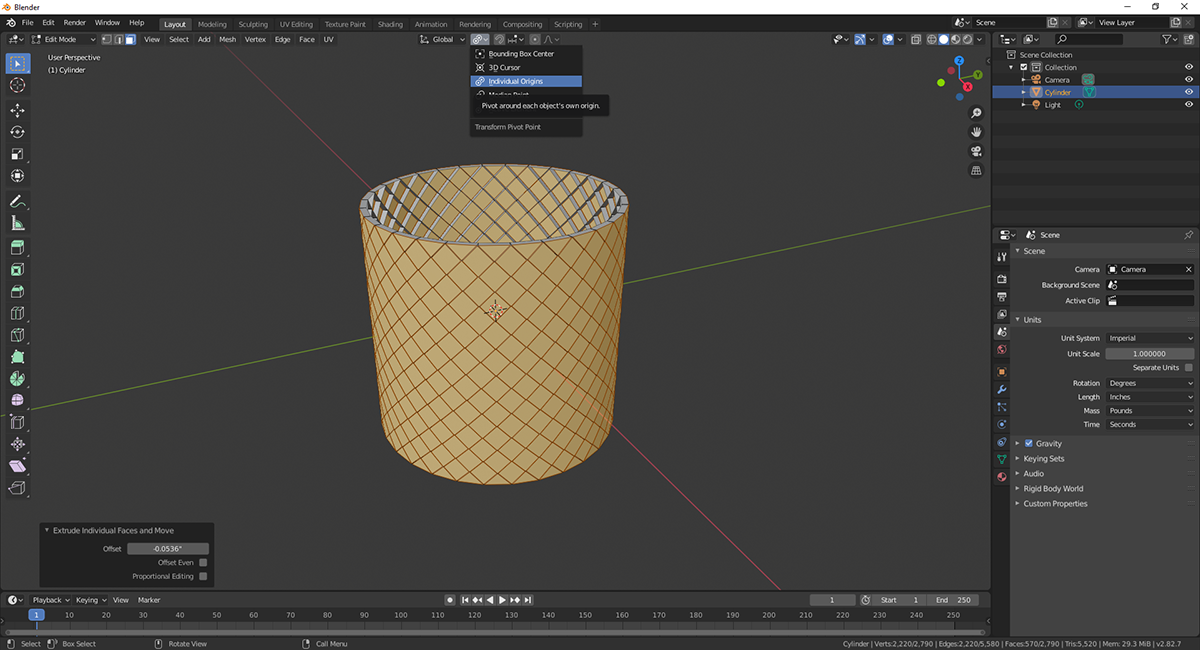 Now extrude the faces by clicking Alt-E and selecting “Individual Faces”. Now move the mouse to move the faces out away from the surface.