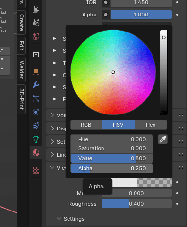 Change the Alpha value. 1 is the default (no transparency) and 0 is fully transparent.